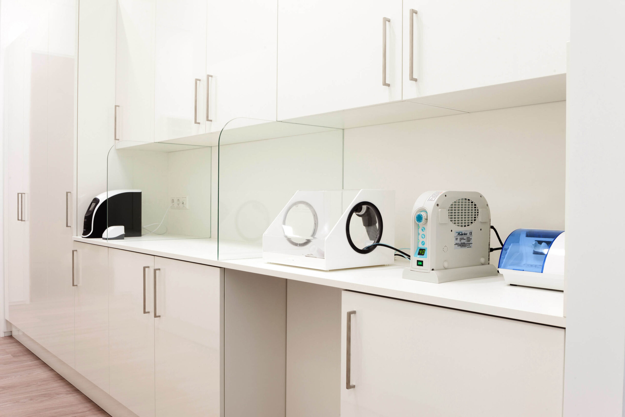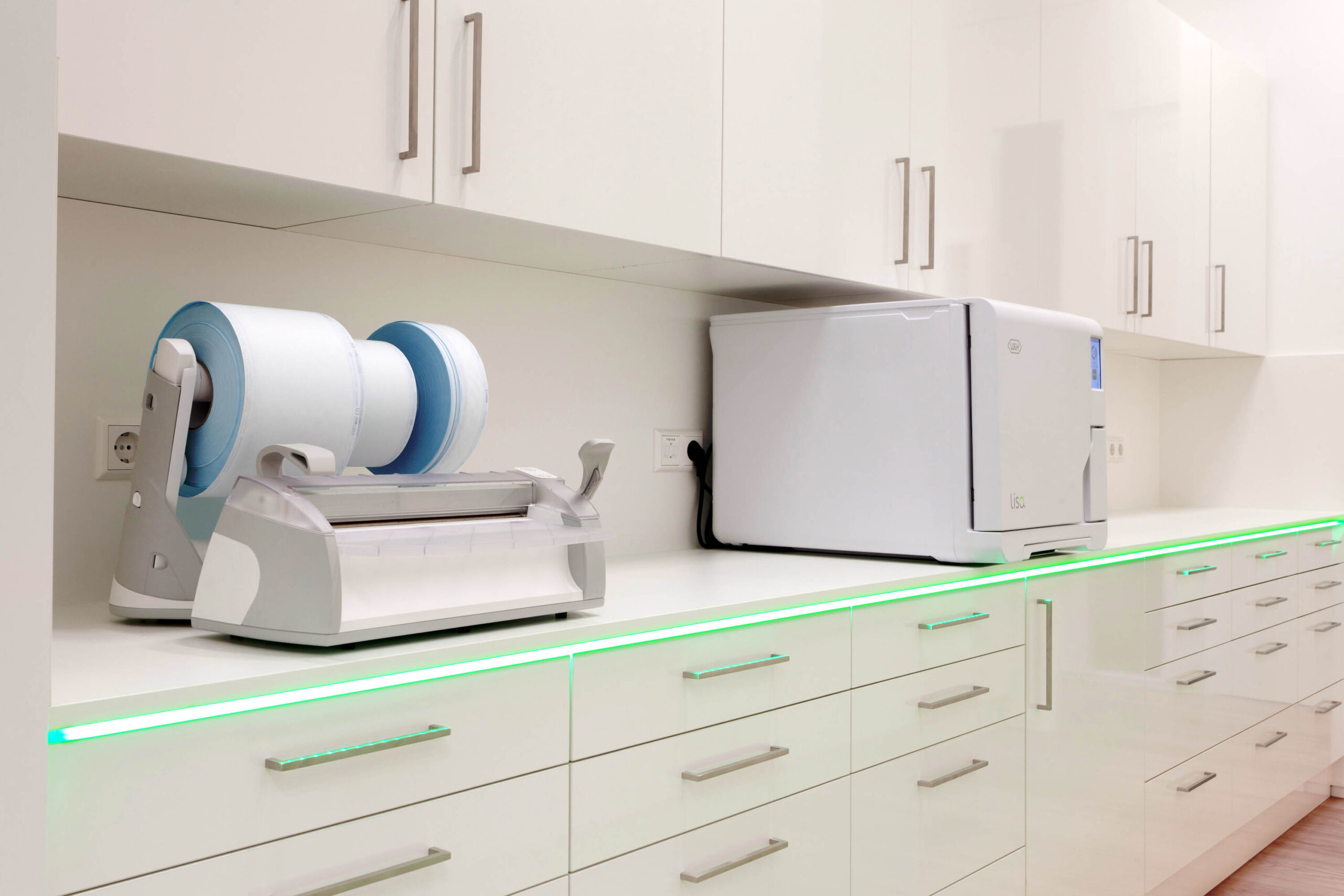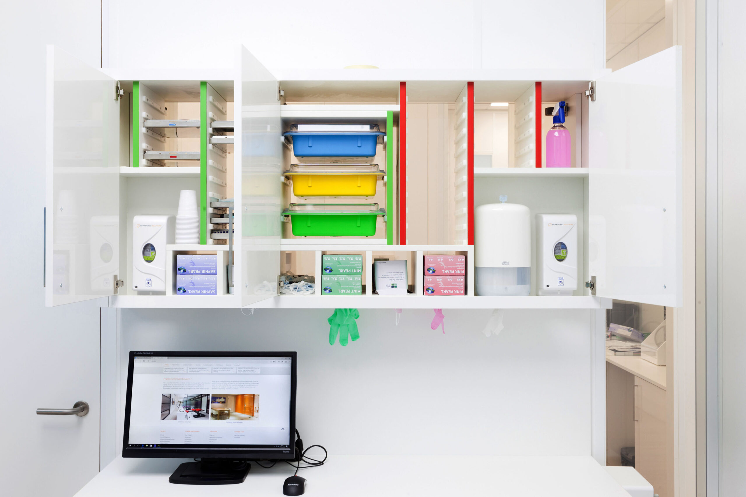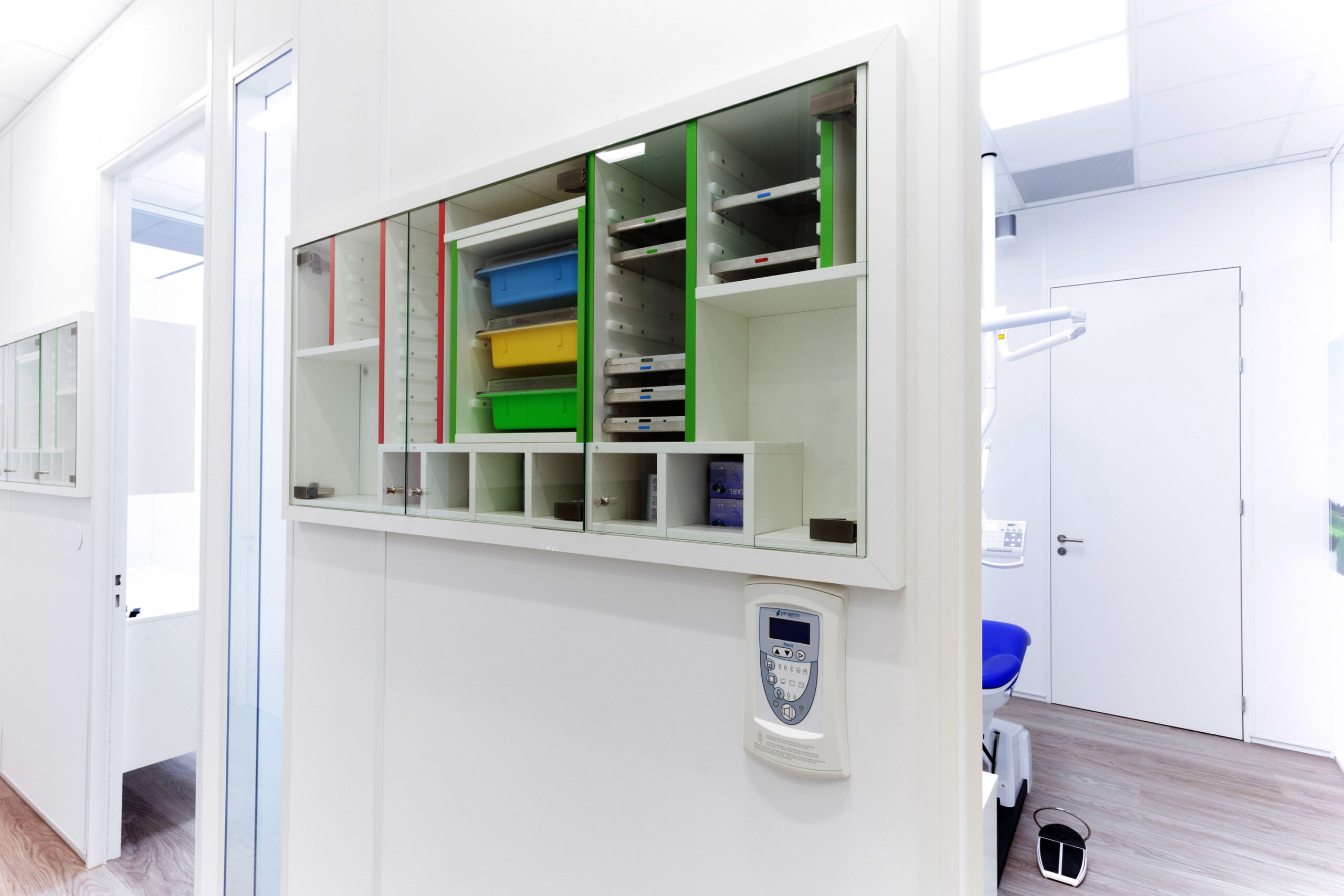 De duidelijke scheiding van het gebied waar de patiënt vertoefd en de overige praktijkruimtes is evident, het verschaft duidelijkheid voor de patiënt. De ruimtes voorreiniging, desinfectie, sterilisatie en voorraad vormen het hart van de praktijk. Hier is het druk, in de behandelkamers heerst er rust.