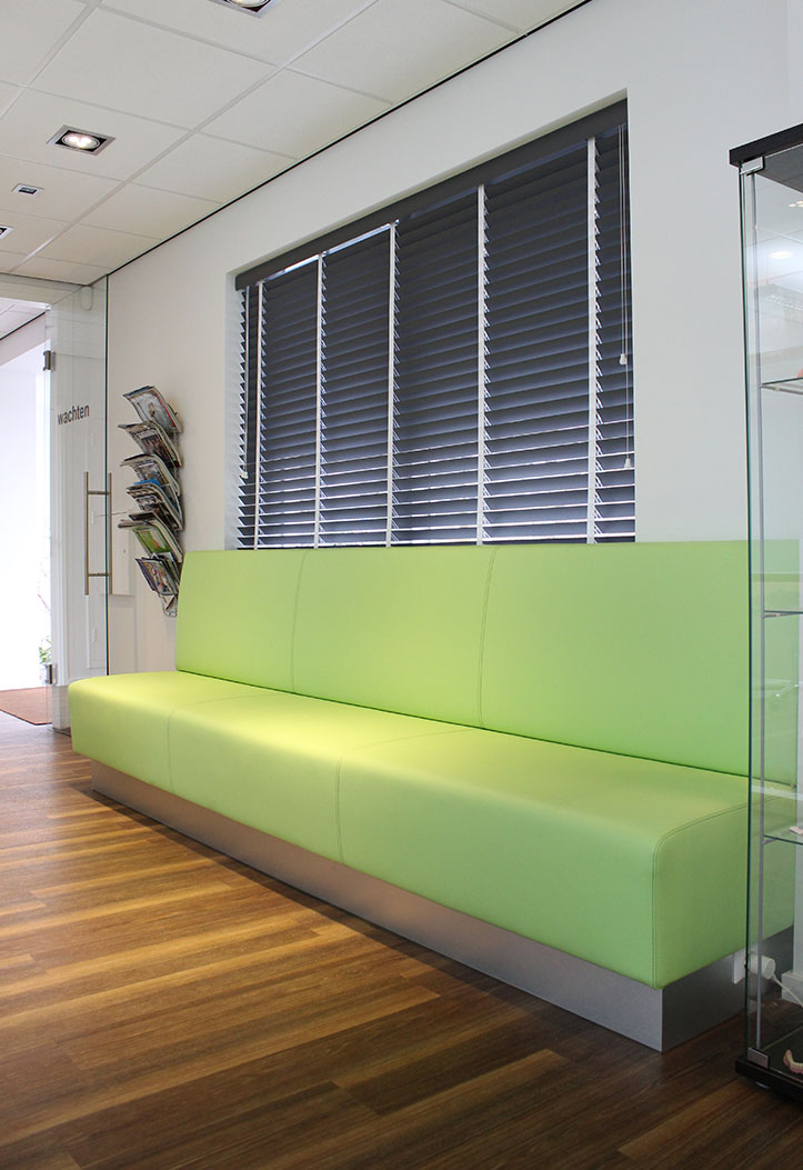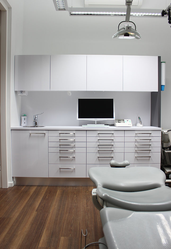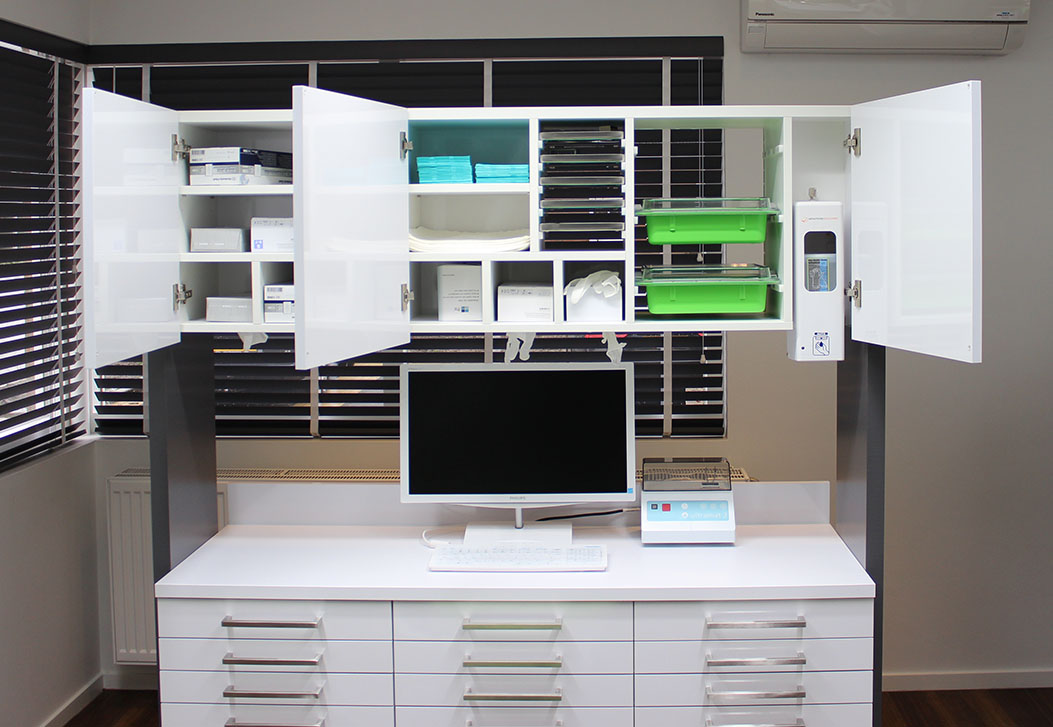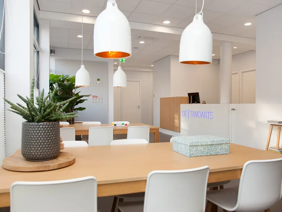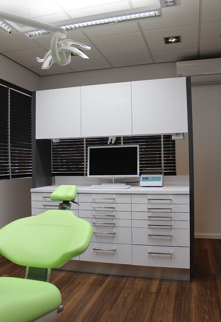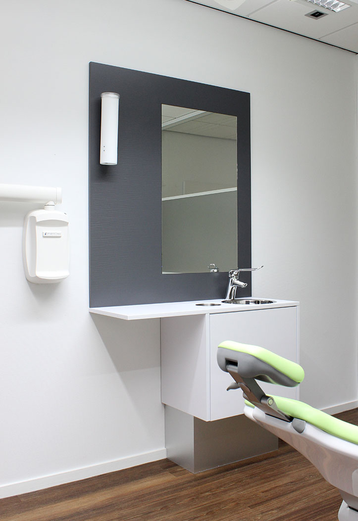 De gang achter de behandelkamers langs is de centrale verkeersader door de praktijk. Bevoorrading vindt continue plaats zonder de behandeling te storen.