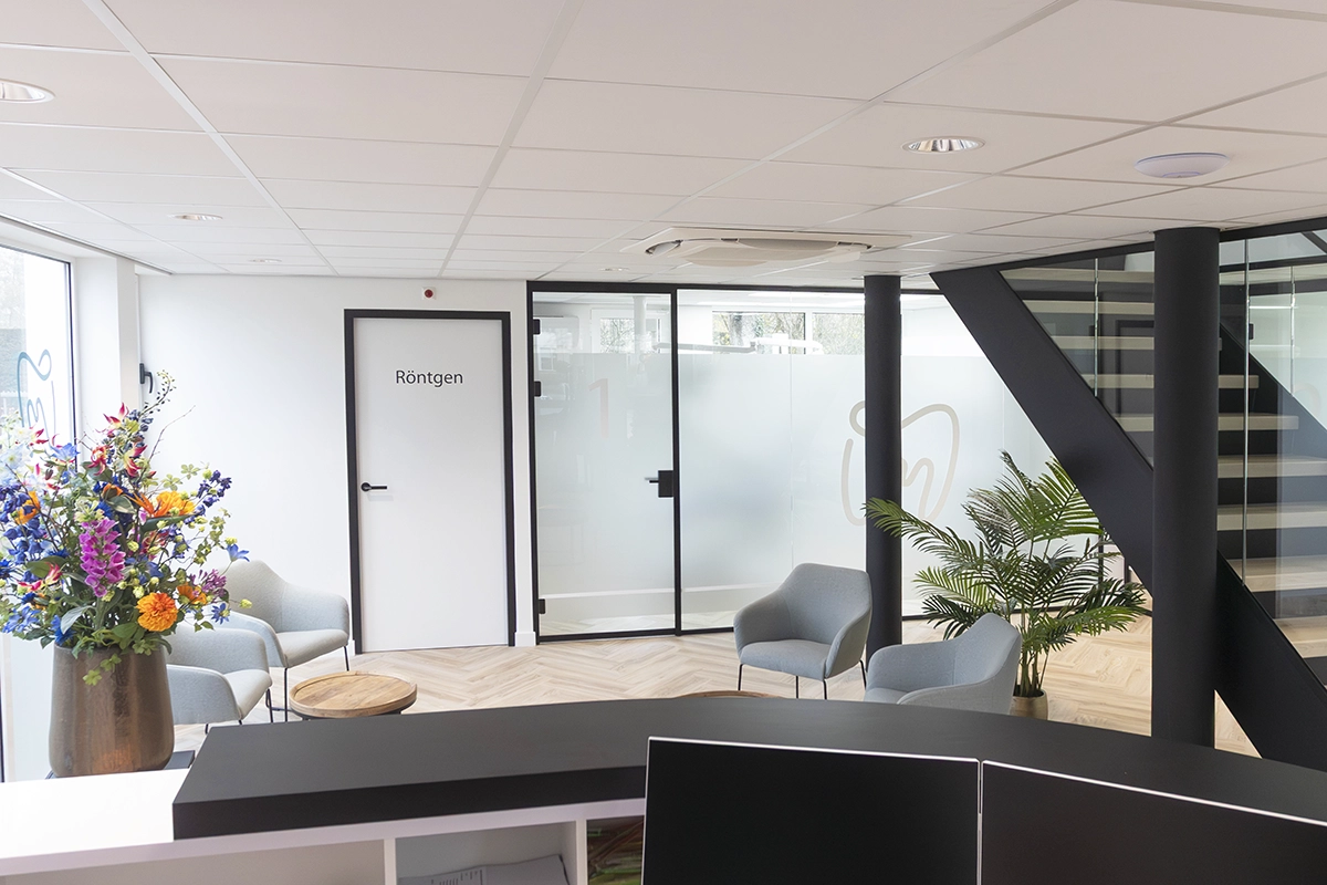 De vriendelijke ontvangst- en wachtruimte met de in het oog springende trapopgang zijn de eye-catchers bij binnenkomst. Op de begane grond zijn naast de